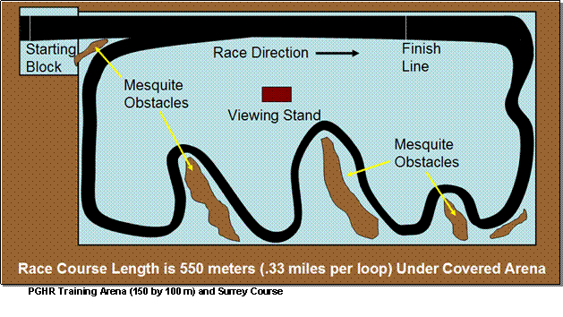 At one end of the open-sided arena, a starting line had been constructed and three racing surreys were lined up as preparations neared completion for the coming race event. Marshall 's eyes traced the path the racing surreys would follow. Within fifty feet of the starting area, the runners would enter the arena proper and proceed in a generally clockwise manner around the outer edges of the arena. He paused to better appreciate the series of barricades alone the return side of the oblong track. Constructed of heavy sections of Mesquite trunks and logs, reinforced with a thorny overlay of fresh-cut branches, the three major lines of obstacles would force the racers to weave drastically on that leg of the course. The course ends were long sweeping turns that led into the long initial straight stretch or the weaving return side. All told, the covered portion of the arena was fully one hundred meters by one hundred-fifty meters, covering a course of five hundred and fifty meters, 0.33 miles.
